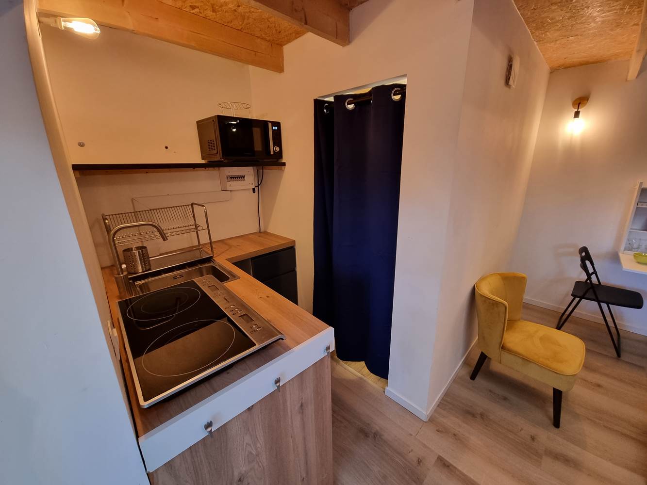 Ce studio indépendant et tout équipé dispose d'une chambre en mezzanine, une kitchenette, une salle de bain avec douche et WC et un séjour. Nous mettons également à votre disposition l'équipement nécessaire pour cuisiner et la vaisselle pour deux personnes.